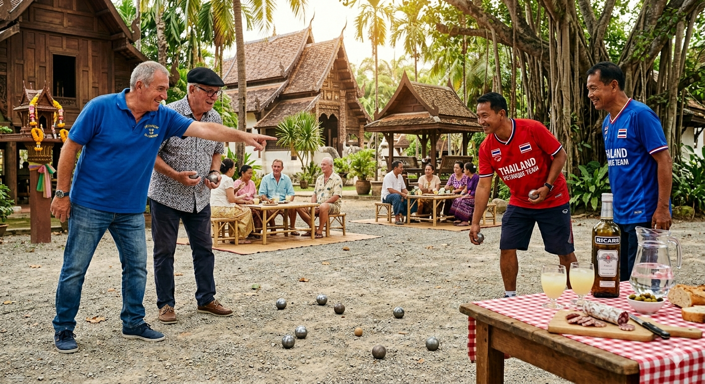En fin d’après-midi, les choses sérieuses commencent… première séance de pétanque. Et pas n’importe comment : dans une ambiance conviviale comme on les aime, avec apéro pastis, saucisson, et surtout la rencontre avec des joueurs thaïlandais prêts à partager ce moment avec vous.